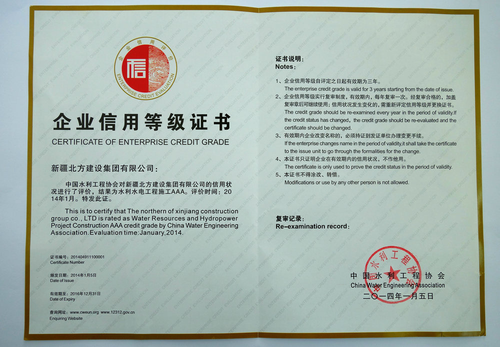 (通訊員 孟慶忠 景小軍 )4日23日,兵團第七師北方建設集團收到了中國水利工程協(xié)會(huì )寄來(lái)的《關(guān)于公布全國水利建設市場(chǎng)主體信用評價(jià)復查結果的決定》(中水協(xié)【2014】9號)文件和企業(yè)信用等級證書(shū)及牌匾。文件和證書(shū)顯示,北方建設集團在全國水利施工企業(yè)信用評價(jià)中取得佳績(jì),喜獲“全國水利建設市場(chǎng)主體信用等級評價(jià)”的最高等級——“AAA級”信用評級。