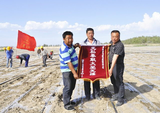 (通訊員 李博瑋)5月12日一大早,126團14連連長(cháng)將一面繡有“無(wú)私奉獻大愛(ài)無(wú)疆”的錦旗送到北方集團廣廈公司黨支部書(shū)記游紅星手中,對該公司在抗風(fēng)救災工作中幫助受災團場(chǎng)職工全力以赴搞好抗災自救工作,為受災農田的補膜、補帶、補種等抗災自救爭取了有效時(shí)間表示感謝。并激動(dòng)的說(shuō):“北方集團的救援隊就是我們的救星,減少了我們呢么多損失,盡管風(fēng)災是毀滅性的,可是我們都看到了希望,是你們幫我們渡過(guò)了難關(guān),謝謝你們,真的很感謝你們!”