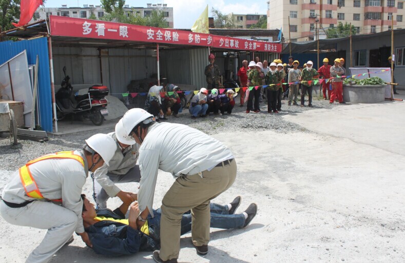 為增強管技人員、勞務(wù)工的施工安全用電防范知識,提高項目部對觸電事故的應急救援能力,北方建設集團獨山子工區在自建小高層舉行了 “觸電安全生產(chǎn)應急預案”演練,演練小組成員各就各位,有條不紊地按照演練方案進(jìn)行分工合作,打電話(huà)報警的、搶救傷員的、抬擔架的只用了短暫的三四分鐘,大家一起把傷員抬上了120急救車(chē)進(jìn)行診斷治療。
