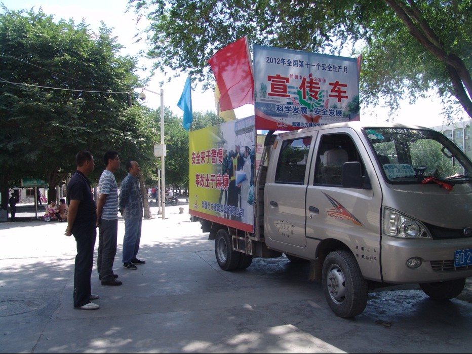 為確保2012年第十一個(gè)“安全生產(chǎn)月”活動(dòng)取得實(shí)效, 6月17日,北方建設集團出動(dòng)安全生產(chǎn)車(chē)在奎屯市區開(kāi)展為期一天的安全生產(chǎn)巡回宣傳活動(dòng)。此次活動(dòng)以“科學(xué)發(fā)展、安全發(fā)展”為主題,宣傳有關(guān)安全生產(chǎn)法規和專(zhuān)業(yè)知識,牢固樹(shù)立集團公司“安全第一、預防為主”的思想和理念,在全社會(huì )積極營(yíng)造人人講安全,事事為安全;時(shí)時(shí)想安全,處處要安全的濃厚氛圍。