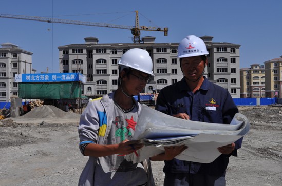 圖為項目經(jīng)理李改民與技術(shù)人員張志虎在仔細查看圖紙