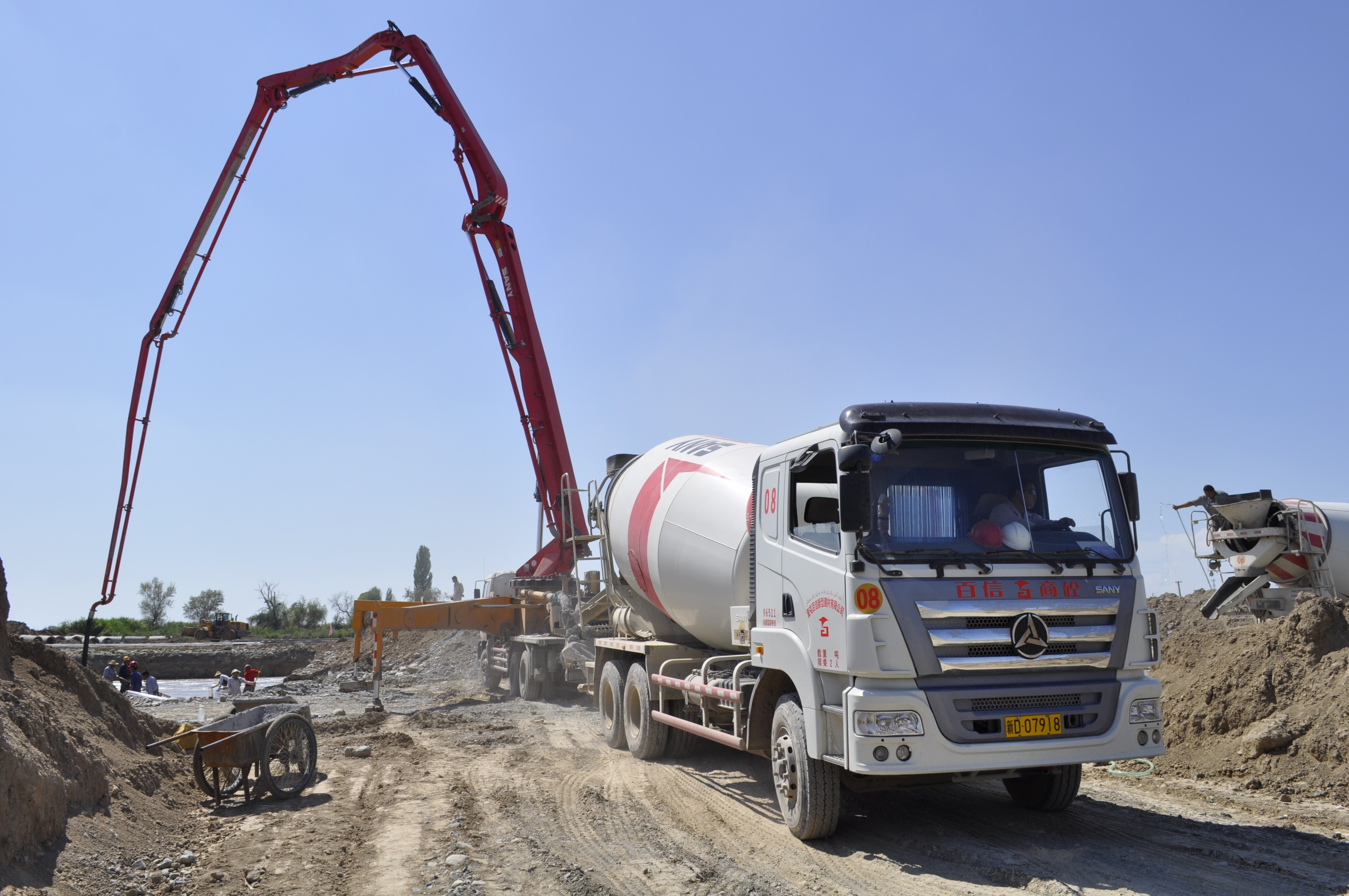 圖為墑混車(chē)在加班加點(diǎn)往施工現場(chǎng)運送混凝土。