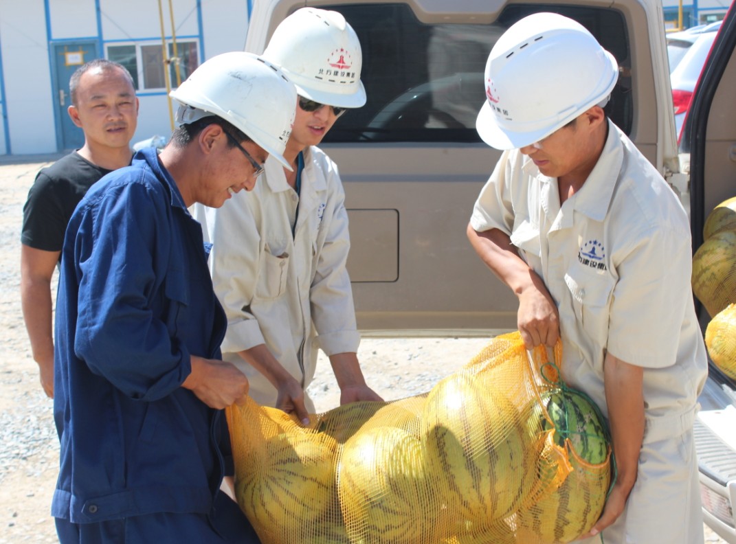 (付宗耀  潘慶麗)726,北方建設集團奎河公司領(lǐng)導來(lái)到一線(xiàn)慰問(wèn)了在烈日下辛勤工作的員工,為他們送上防暑降溫的西瓜。